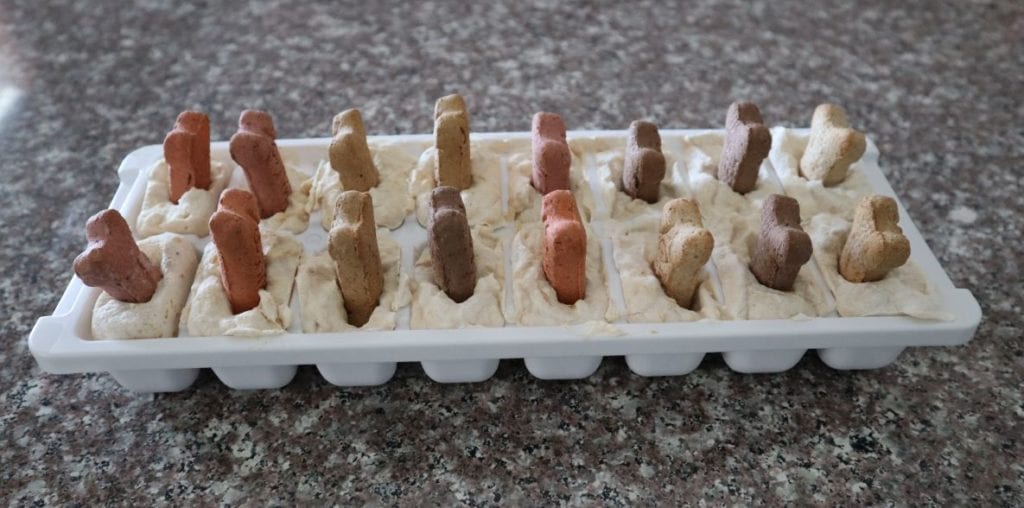 - Optional: Put one treat into each ice cube tray, standing upright.