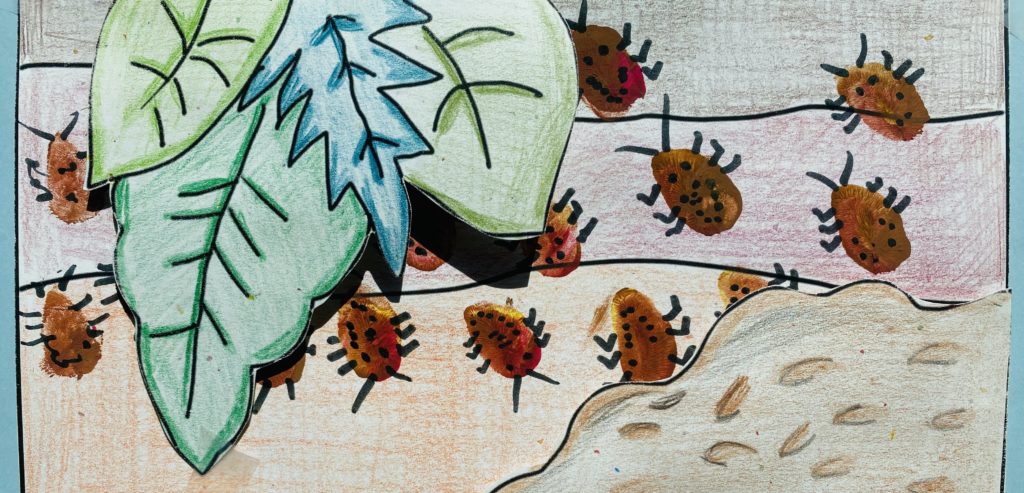 Madagascar Hissing Cockroaches are not pests, do not inhabit human homes, and cannot fly. Unlike other insects that make noise by rubbing their body parts together, these little guys hiss by exhaling air through their breathing holes. Our "hissers" are Animal Teachers named Biggie and the Gang, Biggie being the largest one. Can you hide him in your painting?